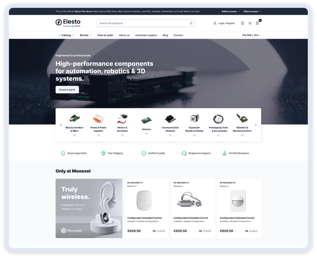 Elesto isn’t meant to be a finished product or a one-size-fits-all solution. It’s an example. A concrete starting point that shows what’s possible when Sylius Plus modules like B2B Suite, RFQ, Product Configurator, and access control are used together in a realistic setup.
